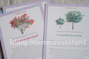 Un petit livret accompagne le jeu pour vous expliquer le mode d’emploi. Vous avez soit la possibilité de choisir une carte au hasard, soit, de la faire choisir à vos enfants, etc. Vous pouvez garder la même carte plusieurs jours ou bien changer dès que vous en avez envie. Vous pouvez faire un choix en fonction des thèmes. Vous serez amené à diriger votre attention sur l’instant présent, à le vivre pleinement.